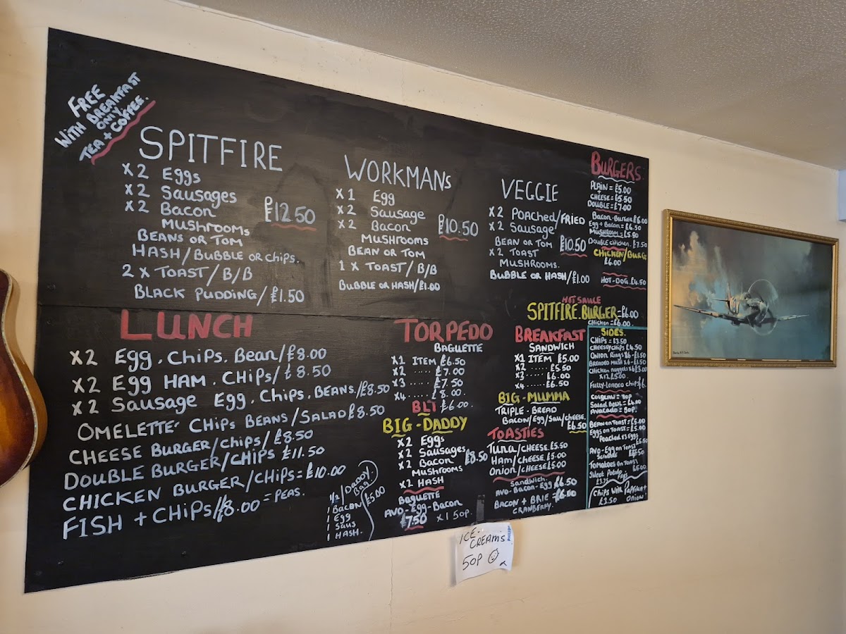 The menu at Spitfire Cafe features a variety of options suitable for breakfast, light lunches, and casual meals. Visitors can expect traditional café offerings including English Breakfast-style dishes, as well as a selection of sandwiches such as tuna and chicken salad. Additional menu items include classic café staples like eggs with chips and beans, jacket potatoes, and chili.